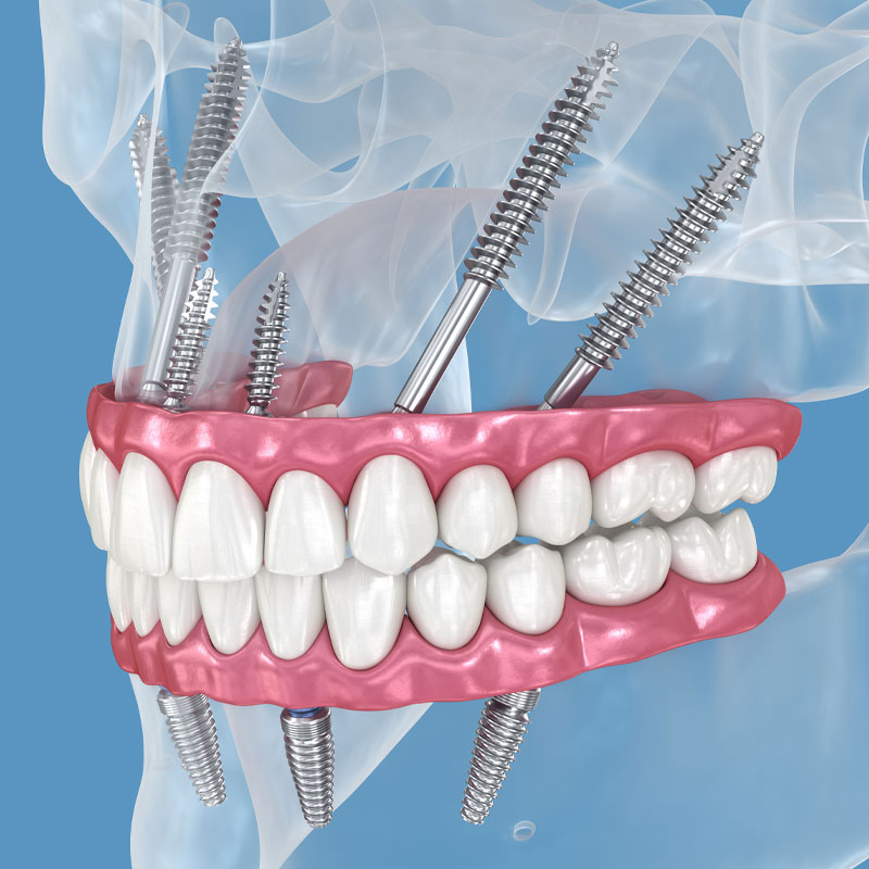 Advanced dental implants anchored in the cheekbone, allowing stable tooth replacement for patients with severe jawbone loss when traditional implants aren’t possible.